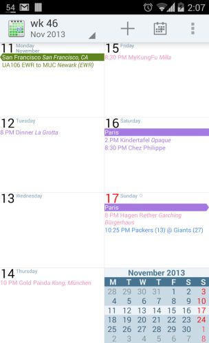 Yukarı veya aşağı kaydırarak takvime ilerleme sağlanabilir.  Sol ya da sağa kaydırarak gün veya aylık hafta görünümleri arasında geçiş yapabilirsiniz. Daha birçok farklılıklar sağlayan aCalendar + ise 4,99 $’dır.