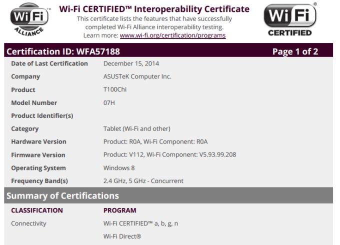 Şimdi eserlerinde bir prim modeli olabilen Asus gibi görünen Asus T100 Chi denen bir cihaz habersiz şekilde WiFi Alliance web sitesine geldi.