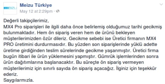 Distribütörün yaptığı açıklama ise tüm dünyada büyük bir yankı uyandırdı. Firma, Meizu’nun MX4 üretimini durdurduğundan dolayı stok sorunu yaşadıklarını ve ama üretimin tekrar başladığını ve Meizu’nun telefonları yolladığını sosyal medya üzerinden açıkladı.