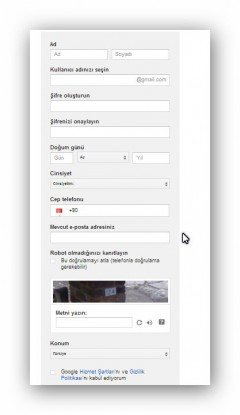 Zira daha önce bu yazımızda da anlattığımız gibi Google Plus gibi popüler bir sosyal medya sitesine giriş yaparken de Google hesabınızın olması gerekiyor. Gogle hesabı almak için öncelikle buradan hesap kaydı için doldurmanız gereken kayıt formuna ulaşabilirsiniz. Karşınıza aşağıdaki resimdeki gibi bir formun çıkması gerekiyor.
